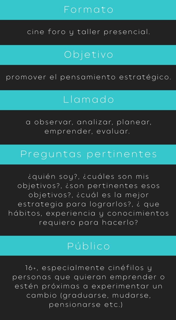 escribir un guion es como hacer un proyecto de vida, quien lo hace debe saber: ¿Qué quiere el personaje?¿que hace para conseguirlo? y si lo logra como consecuencia lógica. Pantalla espejo es un cine foro en donde, paralelo al análisis audiovisual, se formulan proyectos de vida. Quienes participan aprenderán a planear como guionistas, emprender como protagonistas, y evaluar como espectadores de sus historias de vida.