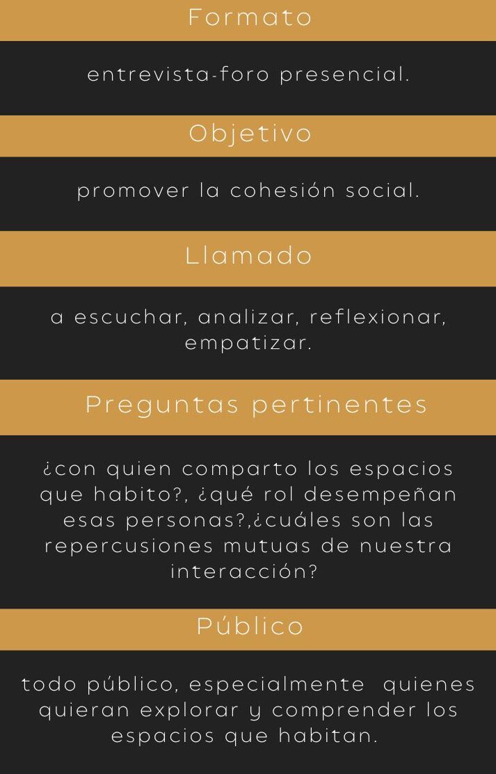 entrevistas a personajes cotidianos en los espacios que habitan. Porque, aunque como humanos nuestra realidad interna es prevalente, siempre es bueno mirar al lado y descubrir que: